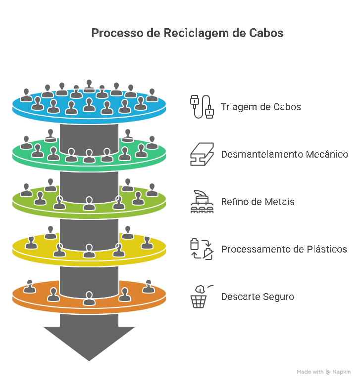 O processo de reciclagem de cabos é técnico e automatizado. Tudo começa com a coleta e triagem dos cabos, separando-os por tipo e composição. Depois, são desmantelados mecanicamente, separando o metal dos materiais isolantes.